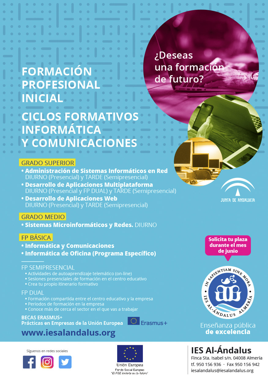 El curso 2018-2019 el IES Al-Ándalus ofertará toda la familia profesional de INFORMÁTICA Y COMUNICACIONES.