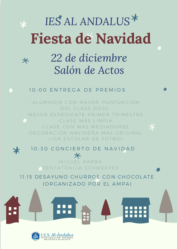 Con motivo del VI Encuentro de Mediación Escolar se organiza un Mercadillo Solidario que tendrá lugar los recreos de la semana del 18 al 22 de diciembre. Además, el día 22 habrá una Fiesta de Navidad y entrega de diplomas para el alumnado y a partir de las 11.30 funcionará el Mercadillo Solidario.