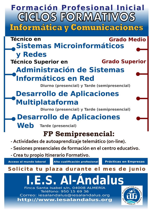 El ciclo de DAW (Desarrollo de Aplicaciones Web) en modalidad "presencial" (clases presenciales de Lunes a Viernes por la tarde) se ofertará a partir del curso que viene (2017-2018) en nuestro instituto, se empezará con 1º DAW, 2º DAW será ya dentro de dos cursos (2018-2019).