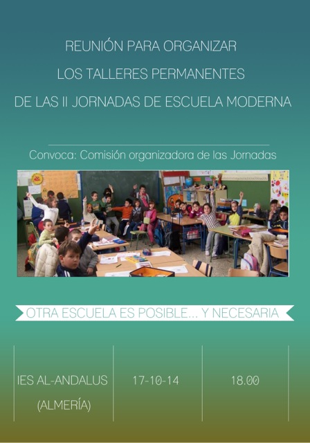 Como preparación para las II Jornadas de Escuela Moderna, se presentarán los talleres permanentes el día 17 de octubre a las 18:00 en el salón de actos del IES Al-Ándalus.