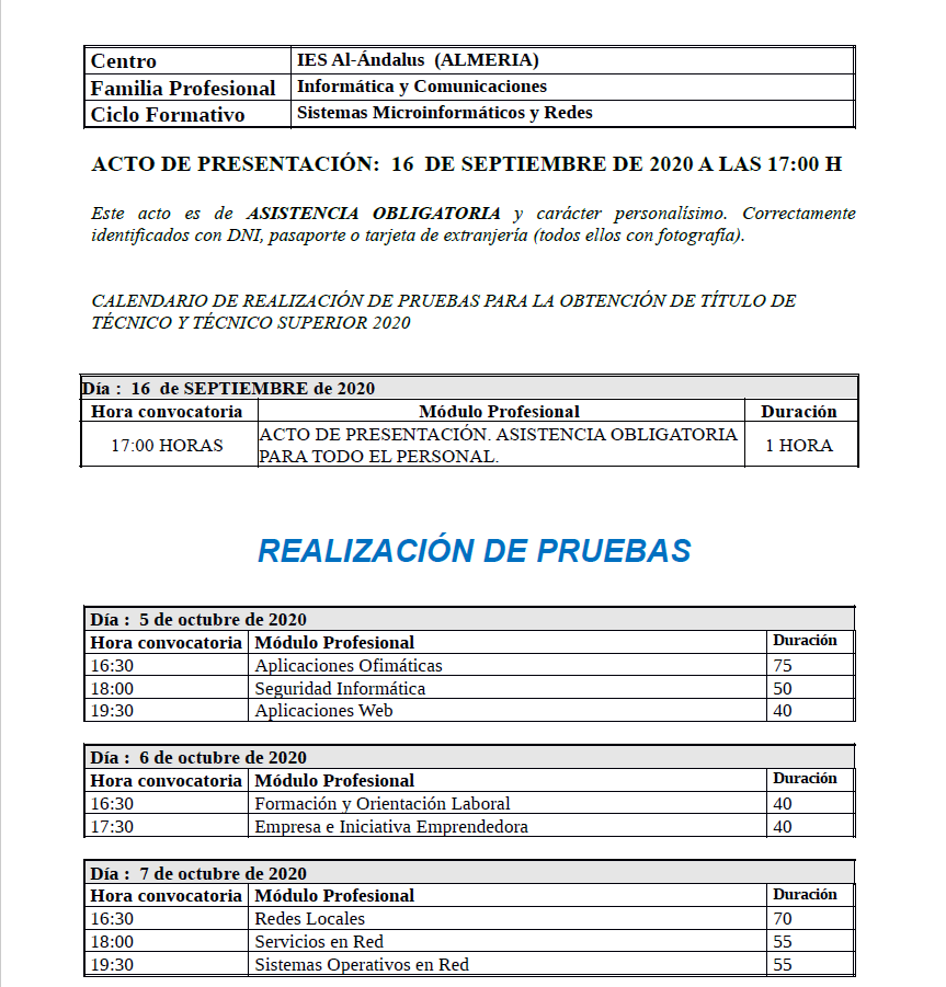 A continuación se muestra el calendario para las Pruebas de Obtención del Título de Sistemas Microinformáticos y Redes.